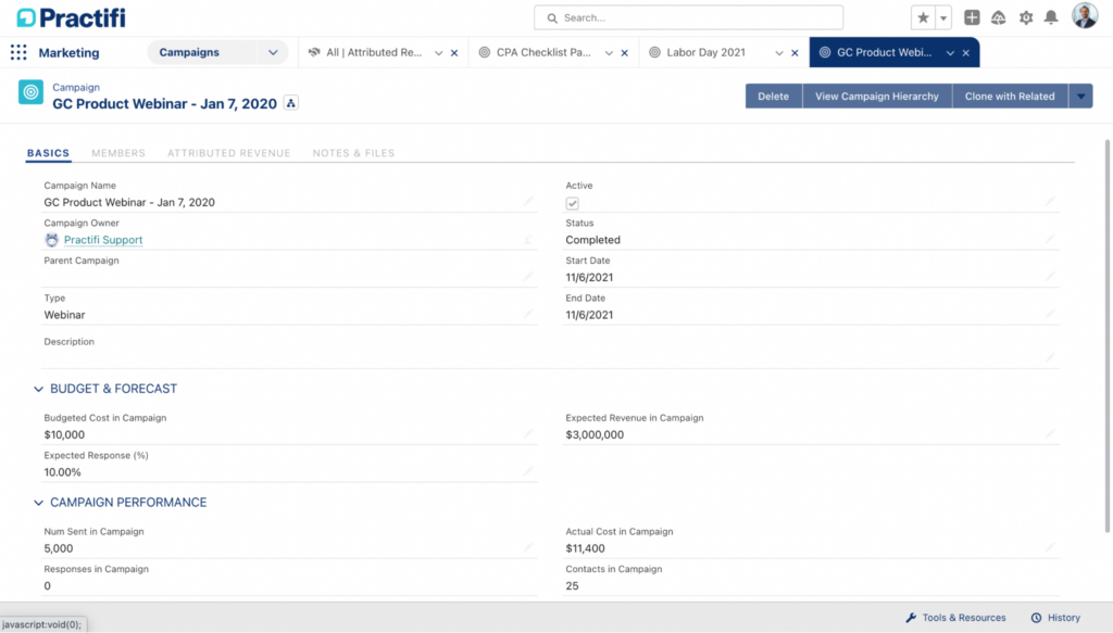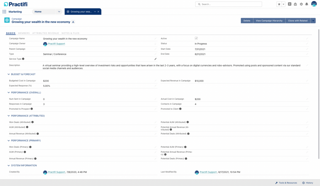 Practifi Promote not only gives marketers access to the data they need to build segmented lists and create meaningful connections, but it also enables them to track campaign ROI. By connecting the firm’s pipeline to current campaigns, marketers can see when deals close and which campaigns influenced them. Specific percentages can be linked to individual campaigns, tracking how much revenue each campaign attributed and comparing ROI against other campaigns. With access to this data, marketers can gain insights into successful techniques and accurately report on campaign ROI.