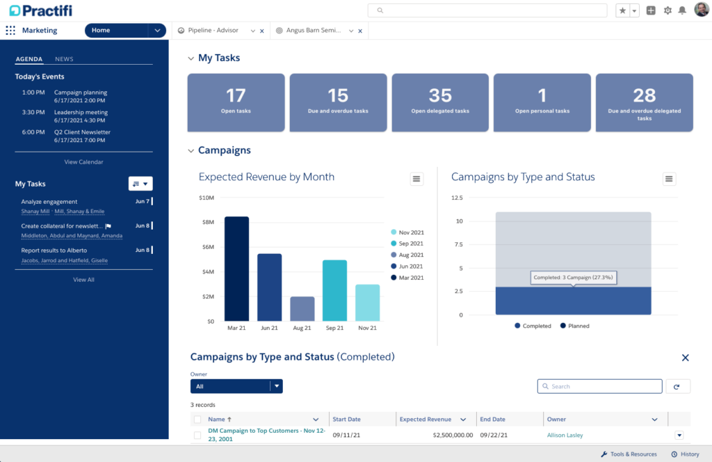 A recent study of wealth management professionals found that 83% of them agree that personalization elevates the customer experience and consequently, creates a competitive advantage. Most marketers can’t create targeted communications to achieve personalization due to siloed data. Without systems to track campaign data, marketers not only struggle to create meaningful connections, but they also can’t gain insights as to how to improve campaign engagement. Understanding campaign performance helps marketers build personalized, meaningful and relevant experiences, which in turn, helps deepen the client-advisor relationship.
