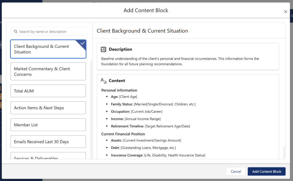 Your firm serves 500 clients across 8 advisors. An admin configures AI content blocks in Smart Notes to auto-generate standardized portfolio summaries, compliance updates, and talking points based on each client’s data. Now every advisor — whether they’ve been with the firm for 10 years or 10 days — delivers the same high-quality, personalized experience. As you add new advisors or expand into new markets, the consistent client experience scales with you.