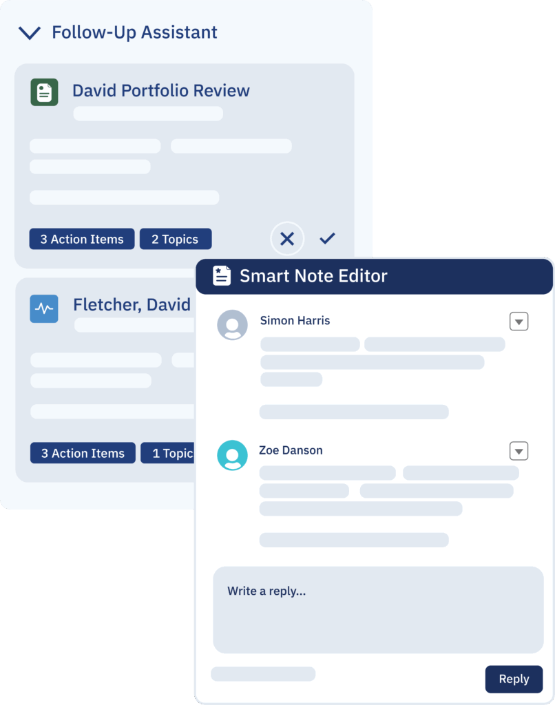 Break down documentation silos. Multiple advisors and service staff can contribute to Smart Notes simultaneously—integrating CRM data, adding observations, and building comprehensive meeting documentation together in real-time. No more version control nightmares or scattered notes across systems.