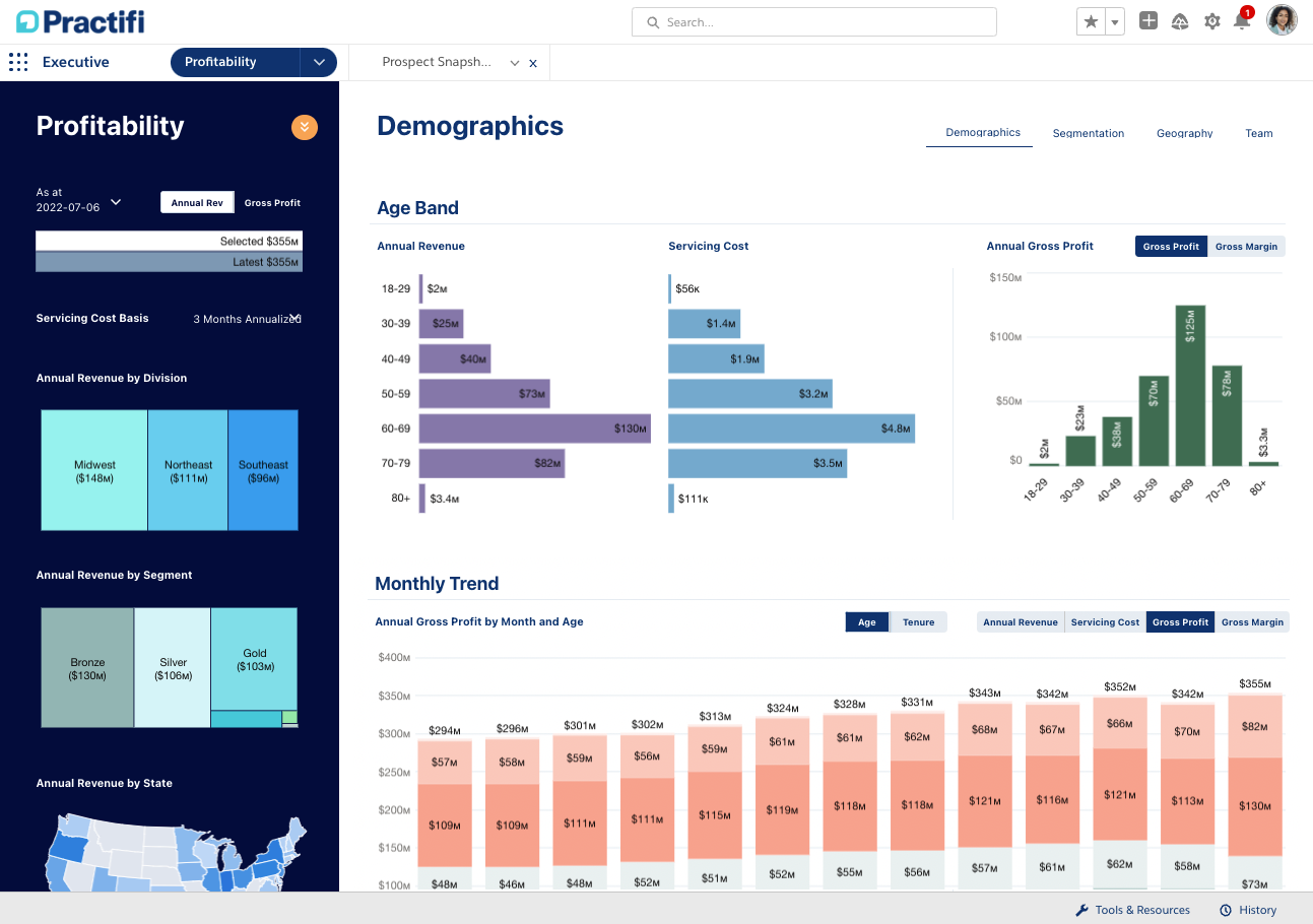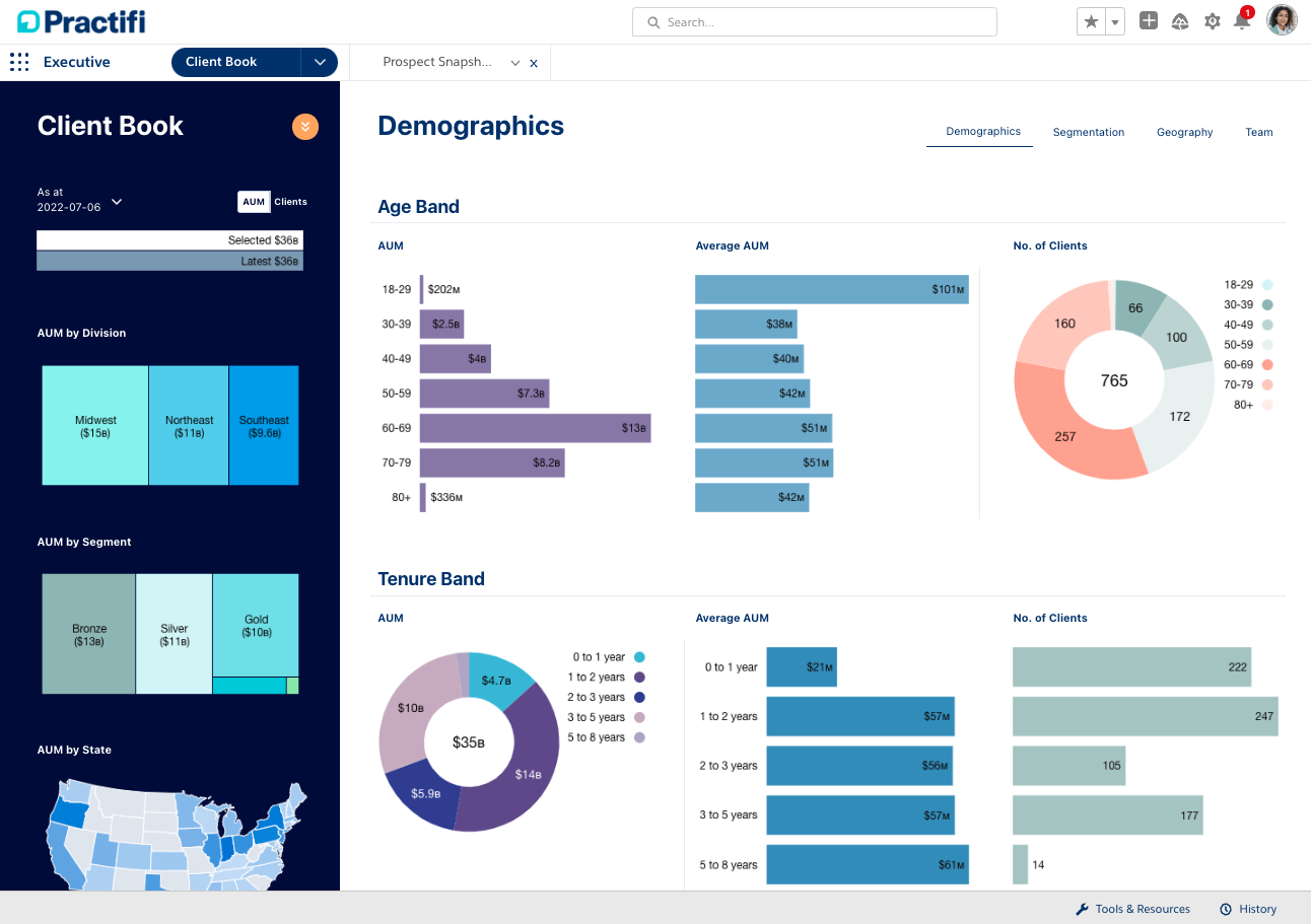 Executives of today’s leading wealth management firms need data to make important decisions regarding clients, profitability and overall business health. Practifi Propel surfaces whole-of-firm data in an elegant and powerful business intelligence experience so executives can make informed decisions quickly.